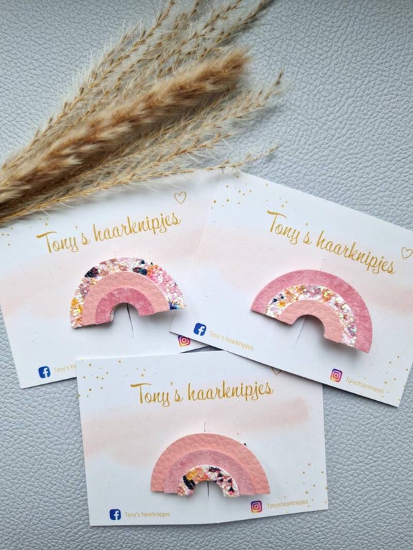 Deze super leuke regenboogjes zijn favoriet bij de meisjes. Ze zijn ongeveer 5cm breed en 2,5cm hoog en in diverse kleuren verkrijgbaar.Bevestigd op een alligatorclip van 3,5cm.