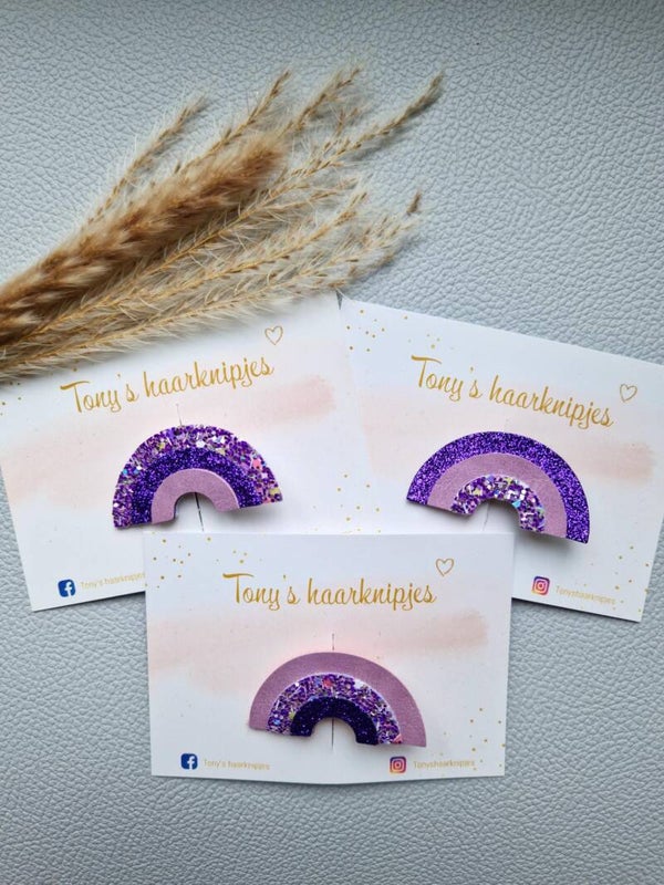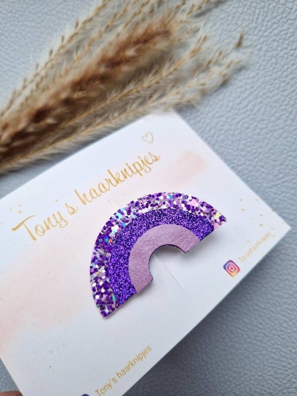 Deze super leuke regenboogjes zijn favoriet bij de meisjes. Ze zijn ongeveer 5cm breed en 2,5cm hoog en in diverse kleuren verkrijgbaar.Bevestigd op een alligatorclip van 3,5cm.