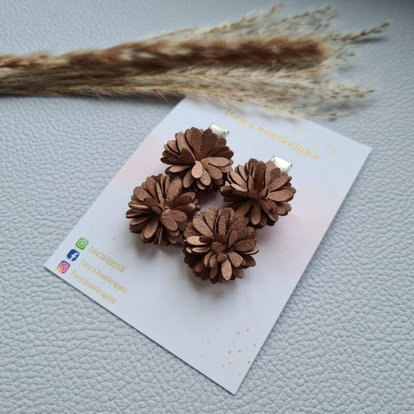 Deze 'look a like' leren bloemen zijn bevestigd op een antislip clipje (2 bloemen). Dit clipje is voor de eerste haartjes of voor de kindjes waarbij de haartjes even op zich laten wachten.