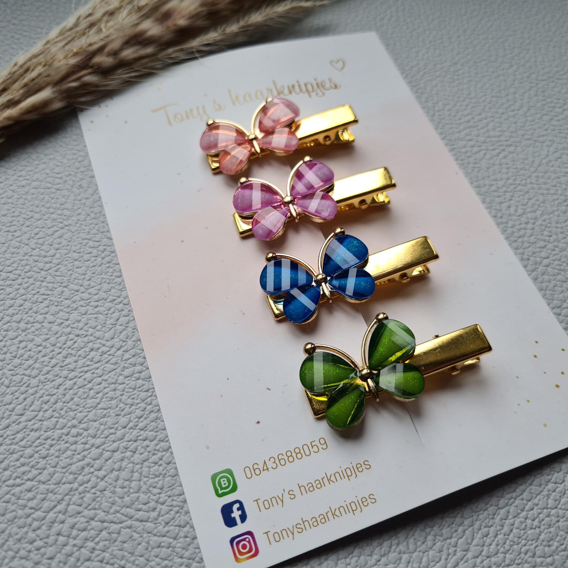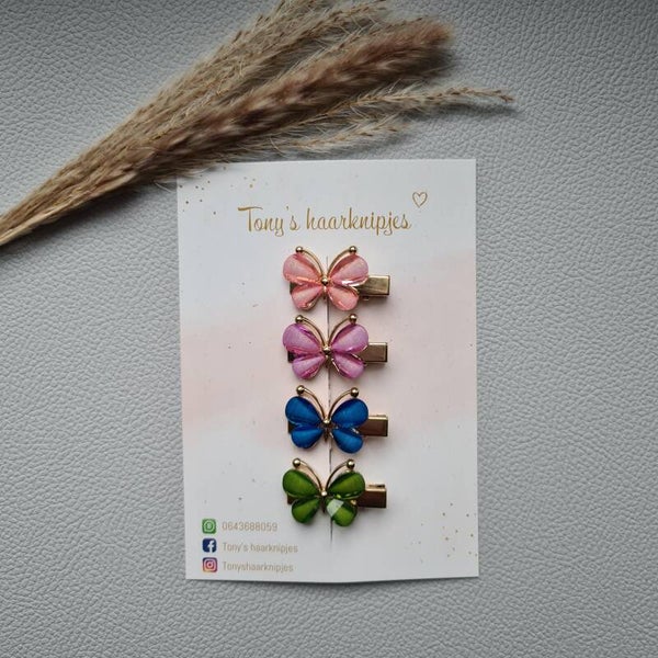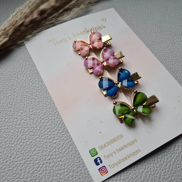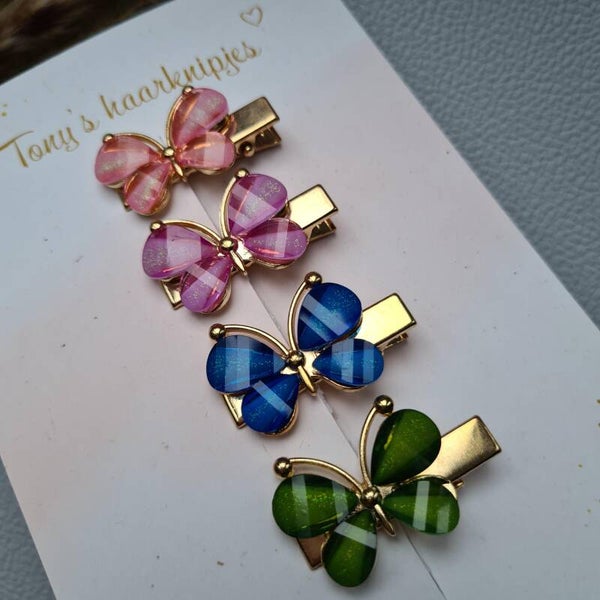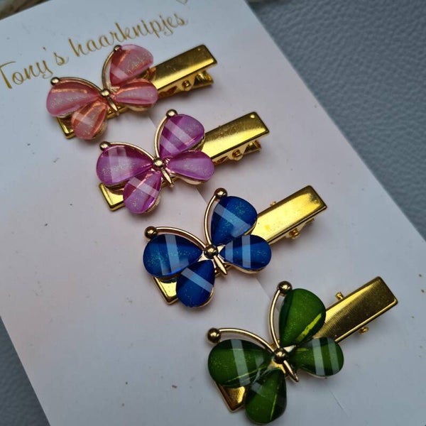 Alligatorclip met vlinder in de kleur lichtroze, paars, blauw en groen.Dit prachtige setje is er in een grote en kleine maat en je kunt kiezen tussen goud- en zilverkleurige alligatorclips.