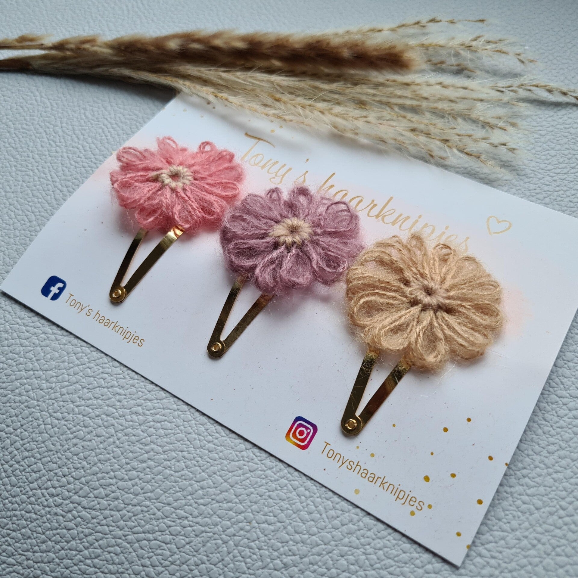 Klikklakspeldjes 5cm met wol bloemen gehaakt roze/paars/lichtbruin