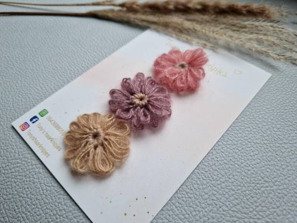 Antislip clipje met wol bloemen gehaakt roze/paars/lichtbruin