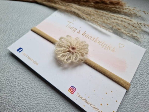 Dit super zachte nylon haarbandje groeit met je kindje mee. Ze kunnen gedragen worden vanaf newborn tot een kindje van 10 jaar of zelfs nog ouder.Nylon haarbandje in de kleur nude met wol bloem gehaakt beige.