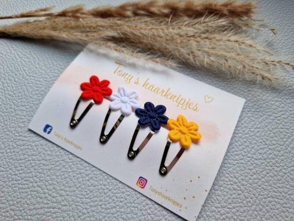 Deze set is verkrijgbaar in een kleine maat klikklakspeldjes (3cm) met 1 bloempje of in de grote maat klikklakspeldjes (5cm) met 3 bloemetjes per klikklakspeldje (zie een voorbeeld van de grote maat op foto 3).
